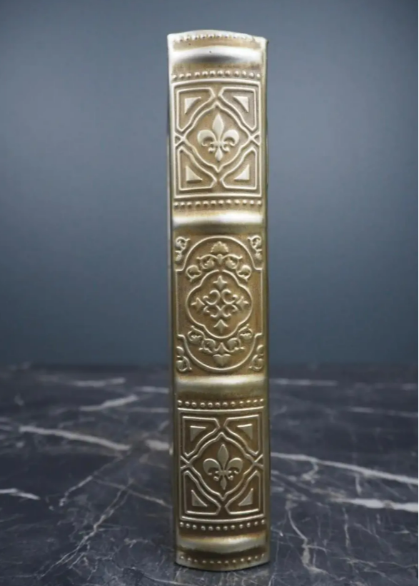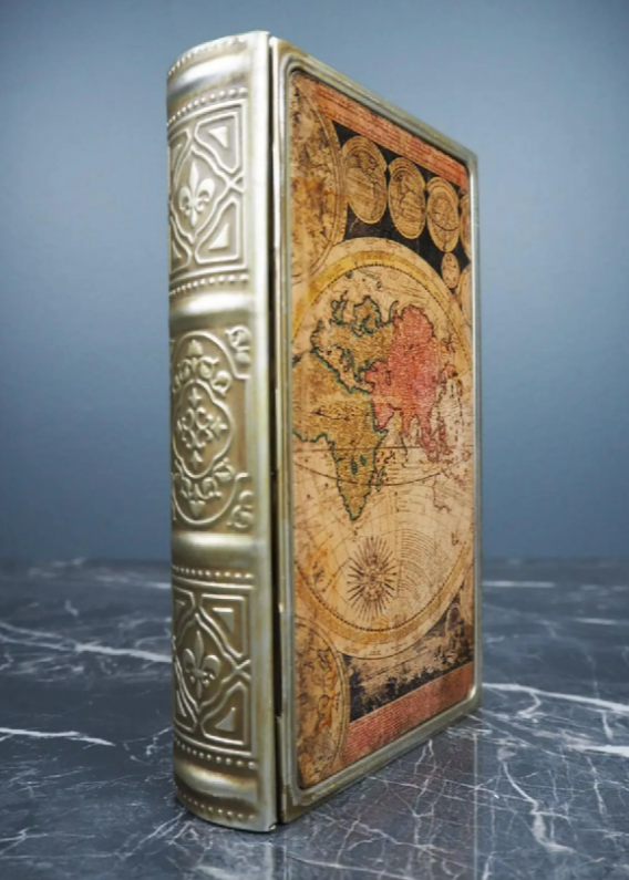 En dekorativ bokgömma i metall med vacker präglad rygg och framsida med motiv av en gammal världskarta. Den antika känslan och de fina detaljerna gör den till ett perfekt tillskott i bokhyllan, på skrivbordet eller i vardagsrummet.