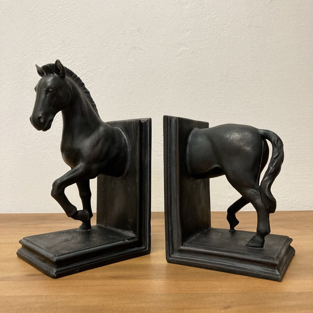 Ett par bokstöd i metall-look som tillsammans bildar en hel häst – ett riktigt blickfång för bokhyllan eller sideboardet. Den matta bun/svarta ytan ger en tidlös och exklusiv känsla, och de passar lika fint i ett rustikt bibliotek som i en modern inredning med karaktär.