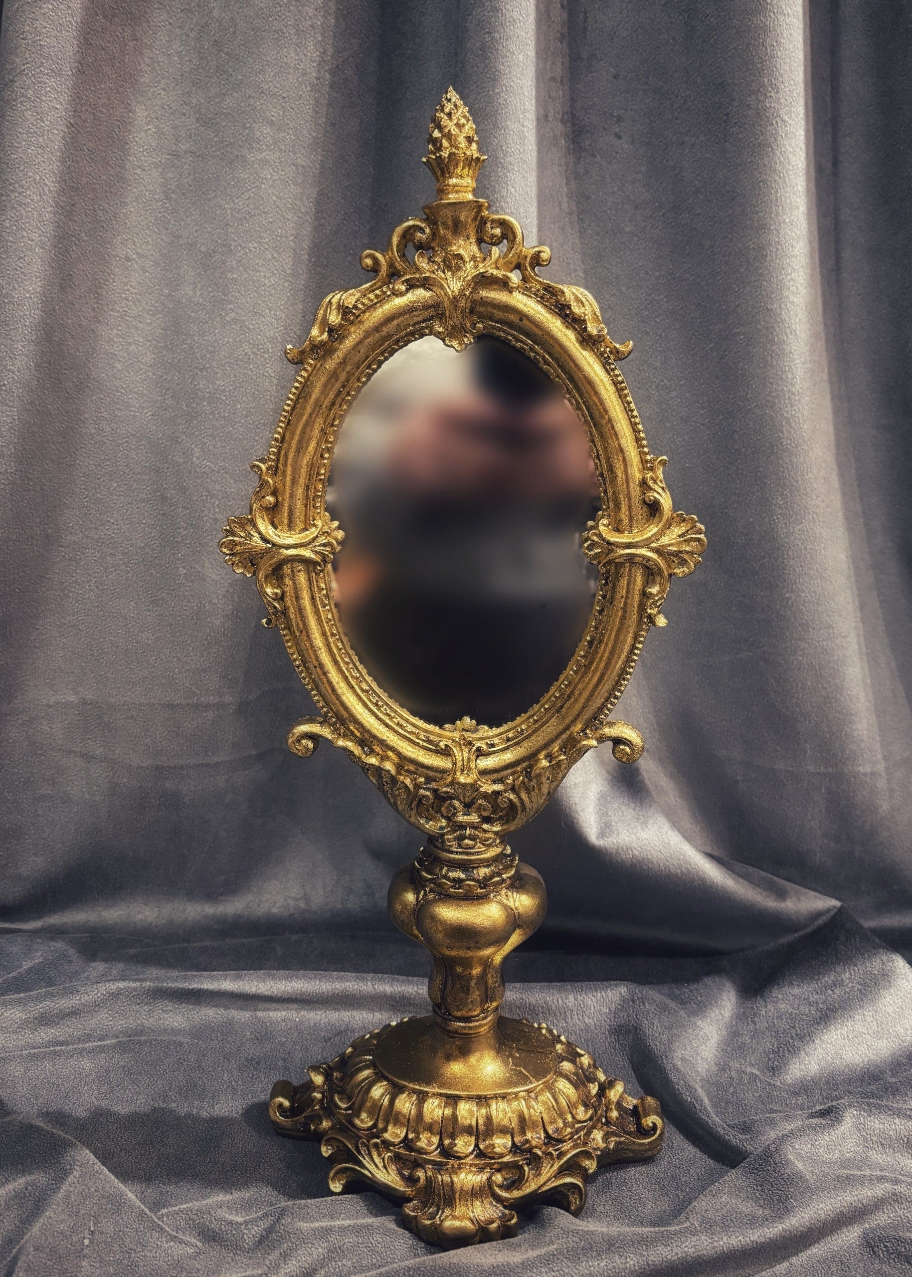 En fantastisk spegel i klassisk barockstil med vackert ornamenterad fot och ram i antik guldnyans. Den skulpterade basen ger en exklusiv känsla och gör spegeln till ett riktigt smycke i hemmet – både funktionell och dekorativ.