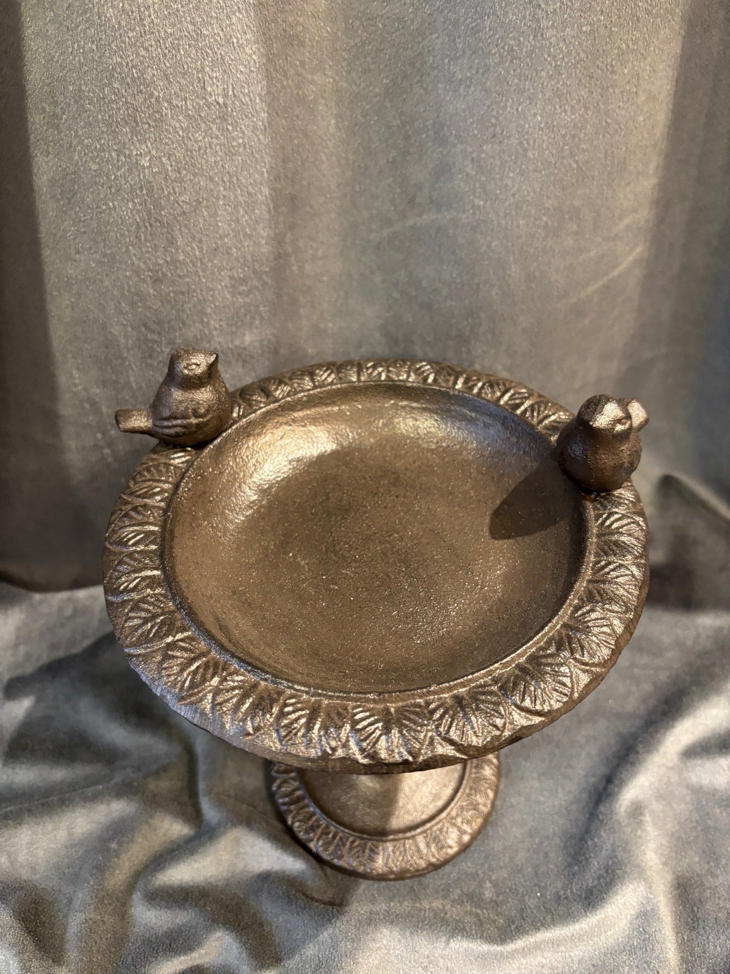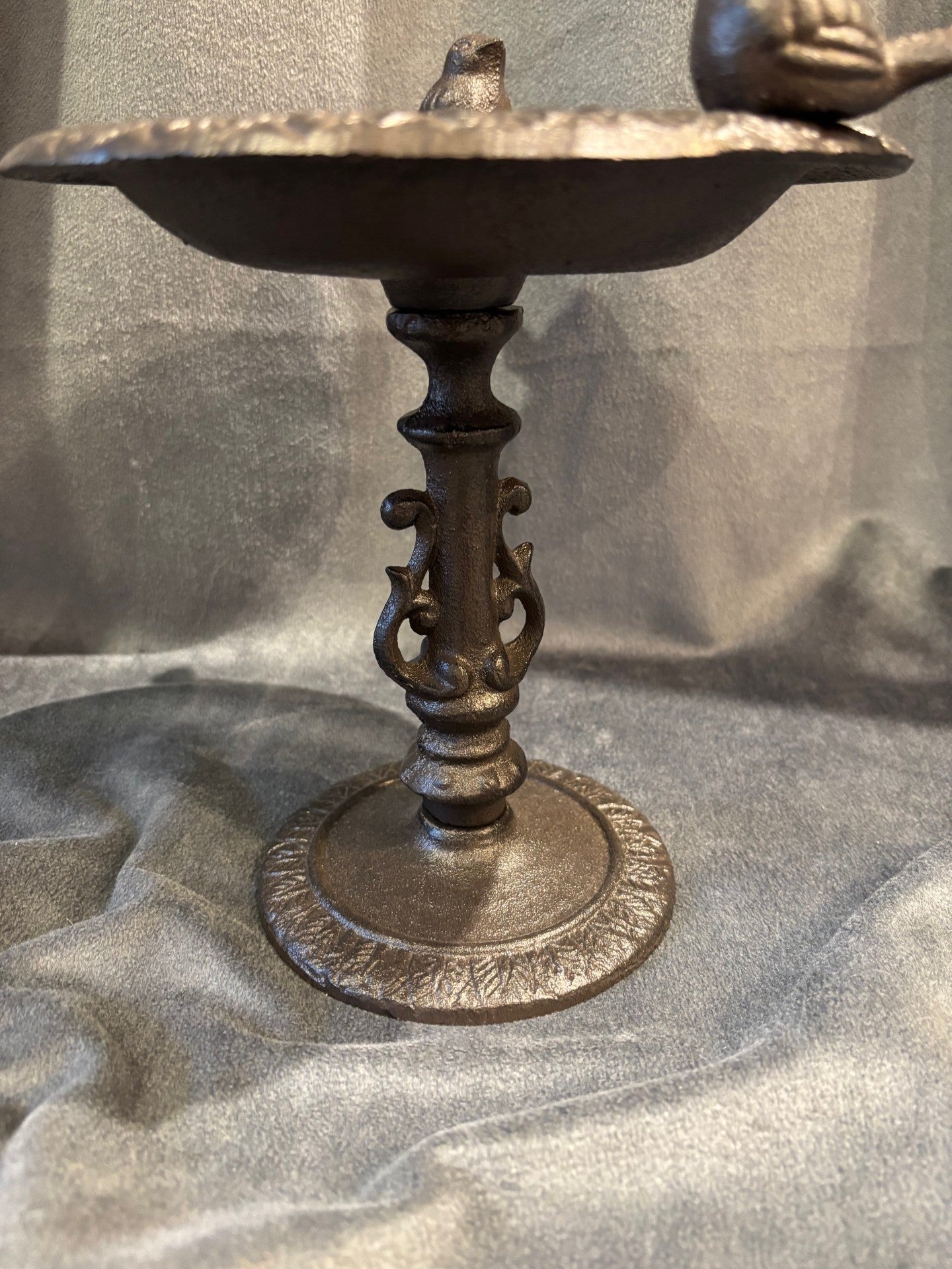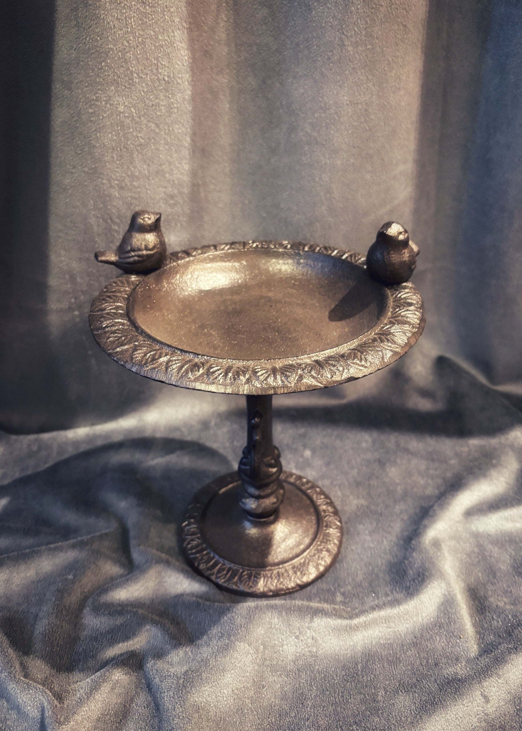 Ett vackert fat på fot i gjutjärn, dekorerat med två små fåglar på kanten. Den antikbehandlade ytan ger en rustik och charmig känsla som passar lika fint i ett lantligt hem som i en mer bohemisk eller klassisk inredning både inne och ute.