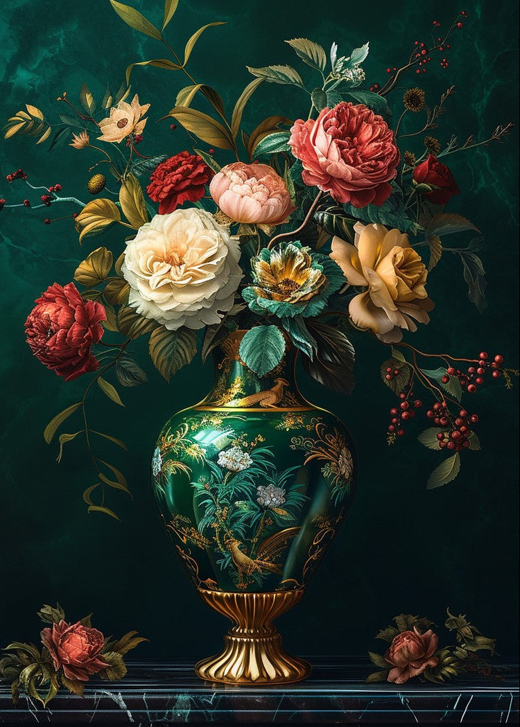En majestätisk och färgstark blomsterbukett mot djupgrön bakgrund – ett motiv som nästan känns tredimensionellt.