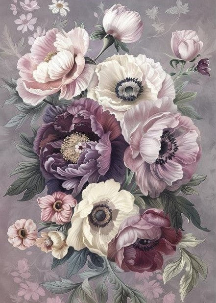 En romantisk och harmonisk poster med stora blomster i lila, puderrosa och cremefärgade nyanser. De mjuka tonerna mot den dimgrå bakgrunden ger en känsla av lugn, elegans och tidlös skönhet. Perfekt som blickfång i sovrum, vardagsrum eller hall – där du vill skapa en stillsam men uttrycksfull atmosfär.
