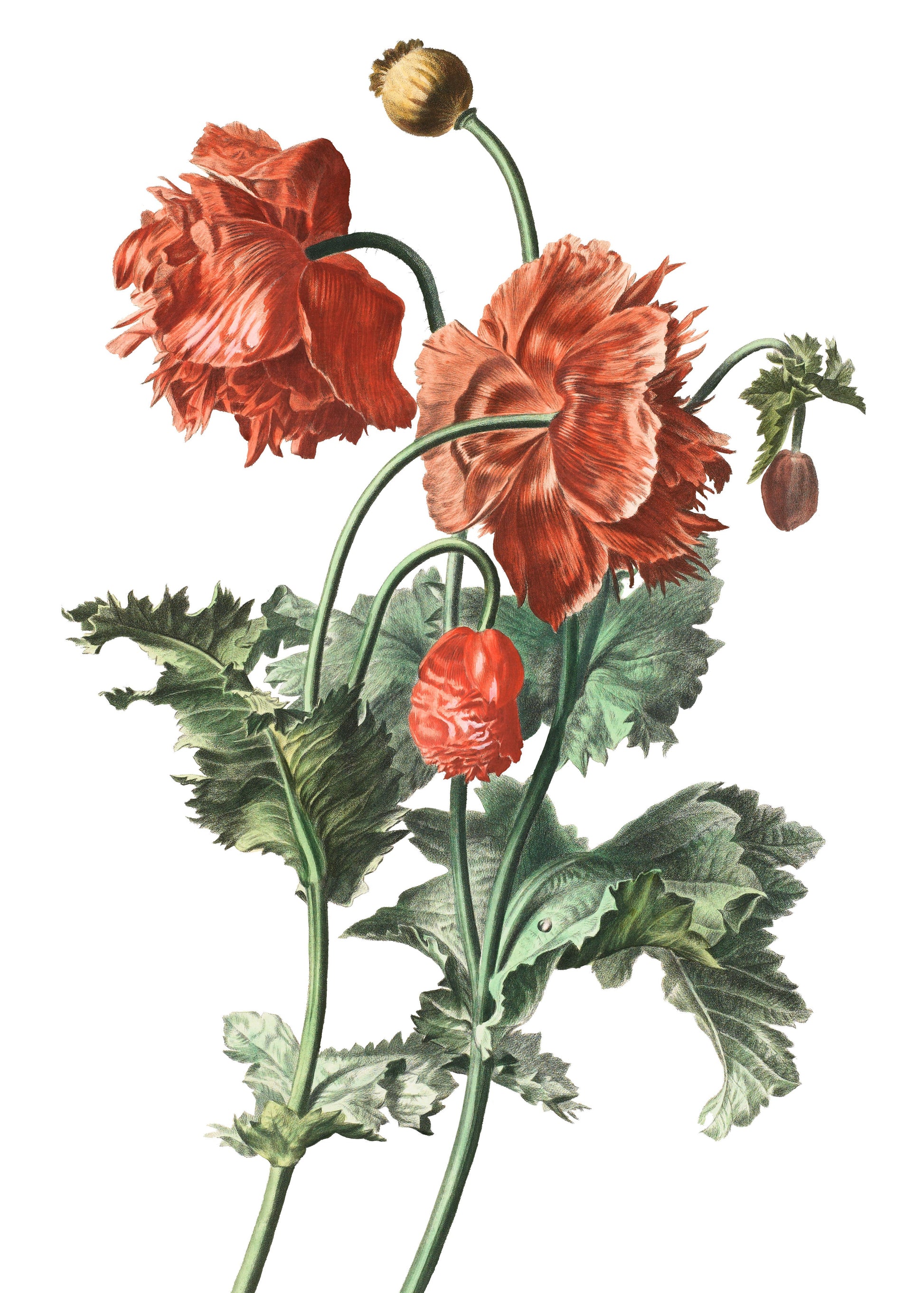 En vacker illustration av vallmoblommor med frodiga gröna blad och brinnande röda toner. Ett motiv som andas både sommaräng och klassisk vintage-estetik.