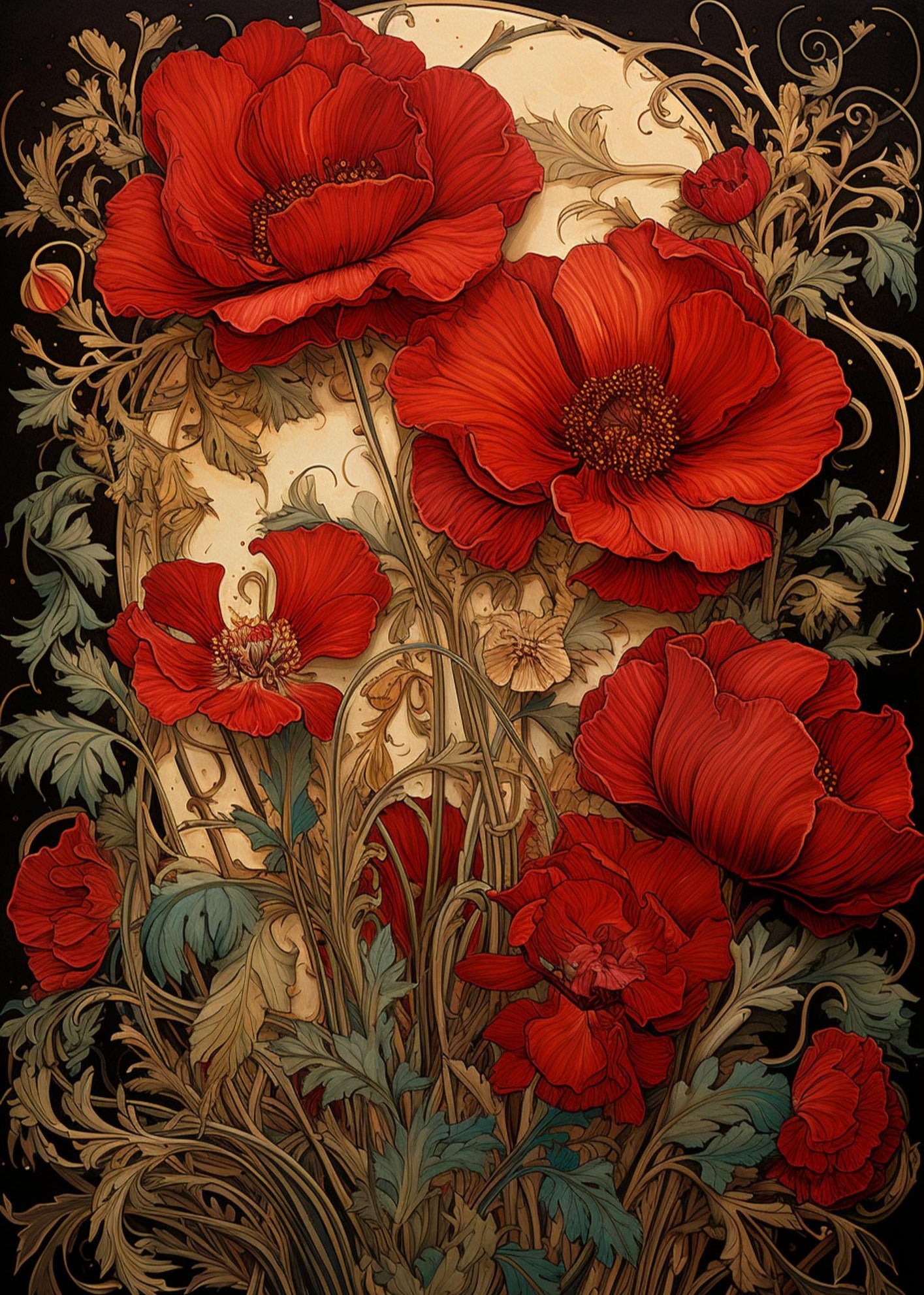En dramatisk och vacker poster med röda vallmo mot en gyllene månskiva. Ger en känsla av mystik och konstnärlig elegans i ditt hem.