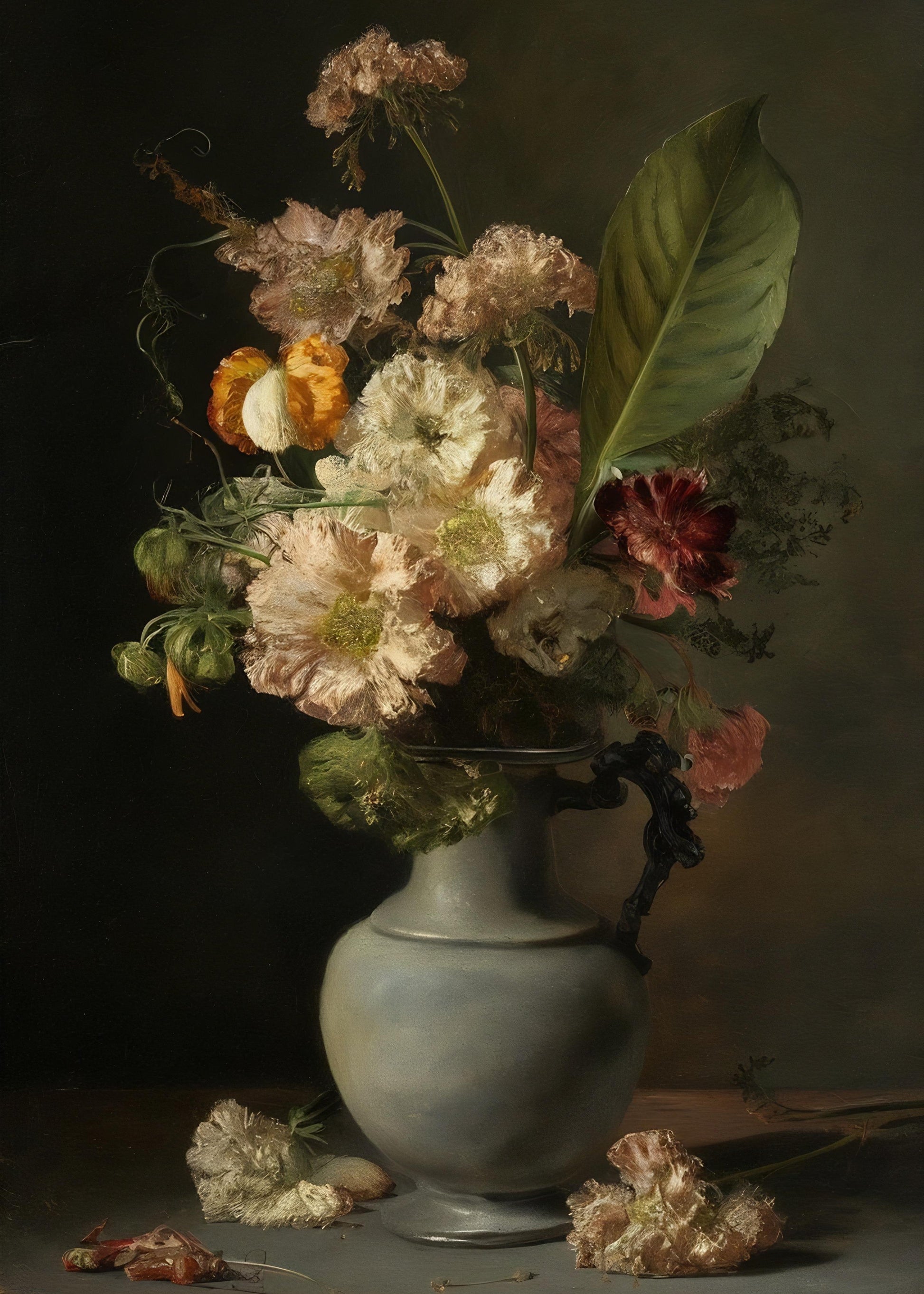 Den här postern fångar det där ögonblicket strax innan buketten helt ger upp – när blommorna fortfarande är vackra, men bär på en poetisk skörhet.