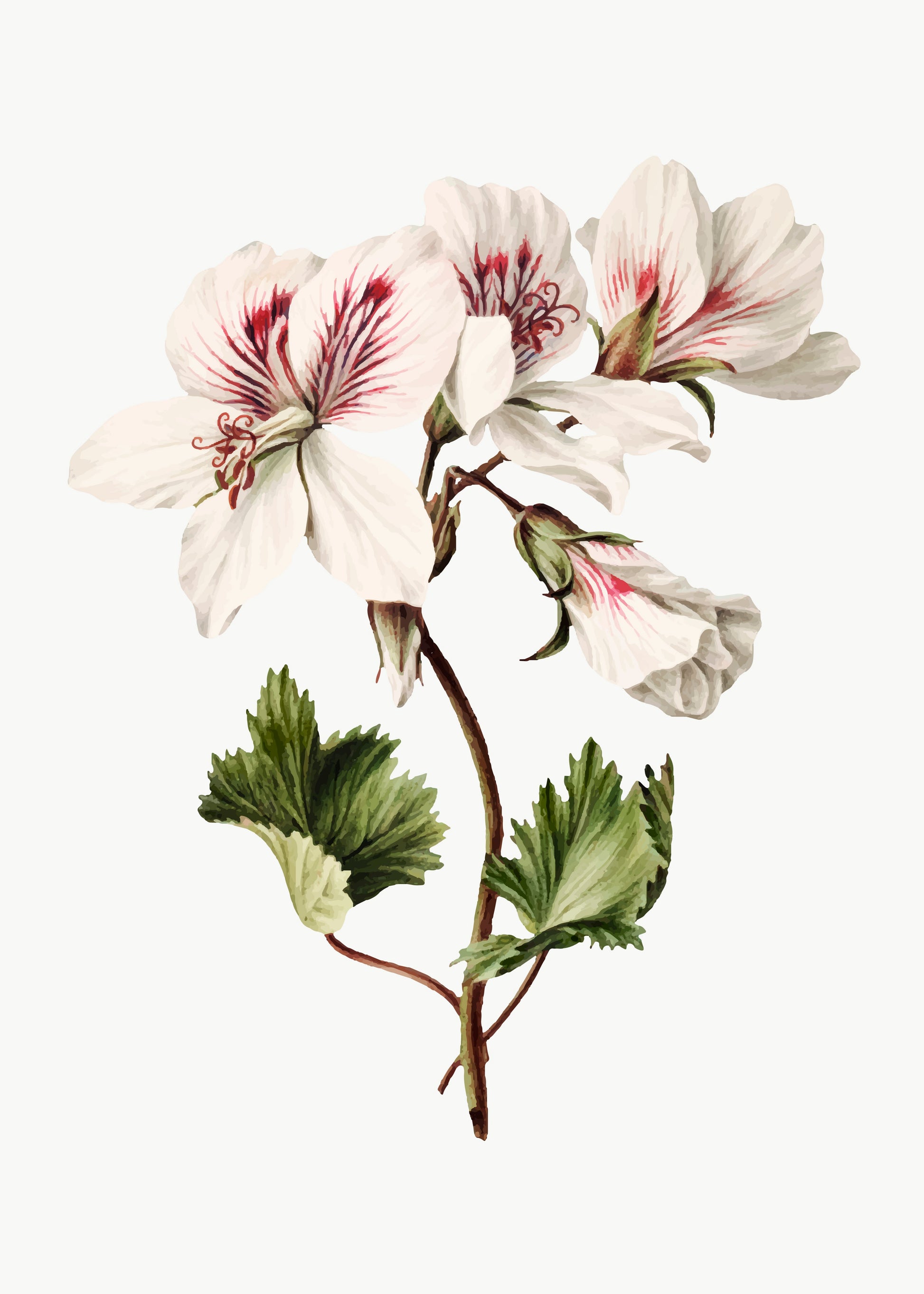 En klassisk pelargon i botanisk stil – enkel men otroligt vacker med sina vita kronblad och röda detaljer. Perfekt för dig som vill skapa en tidlös och lantlig känsla i hemmet.